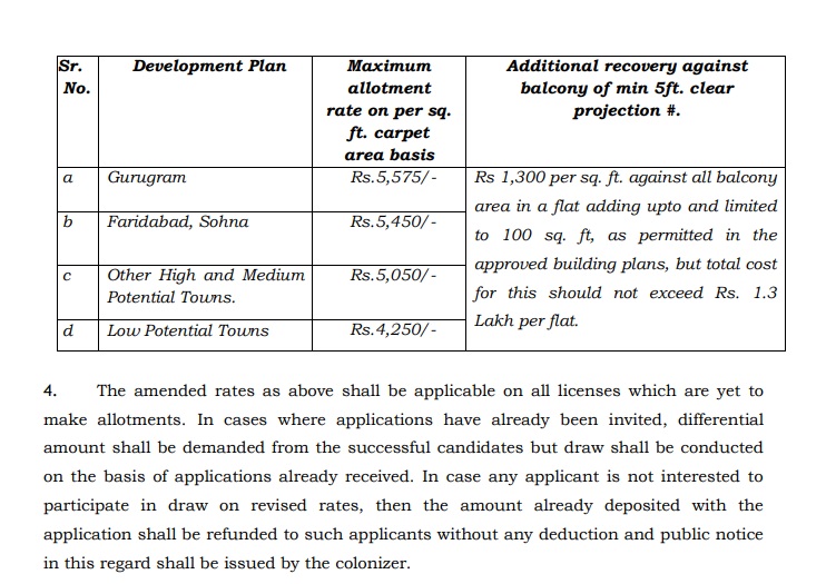 for Gurgaon, Faridabad, Panchkula, Pinjore-Kalka region – The allotment rate for the Apartment units approved under such projects shall be as follows: